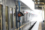 車掌さんは安全確認して手を挙げ、自信に満ちた一安心。
