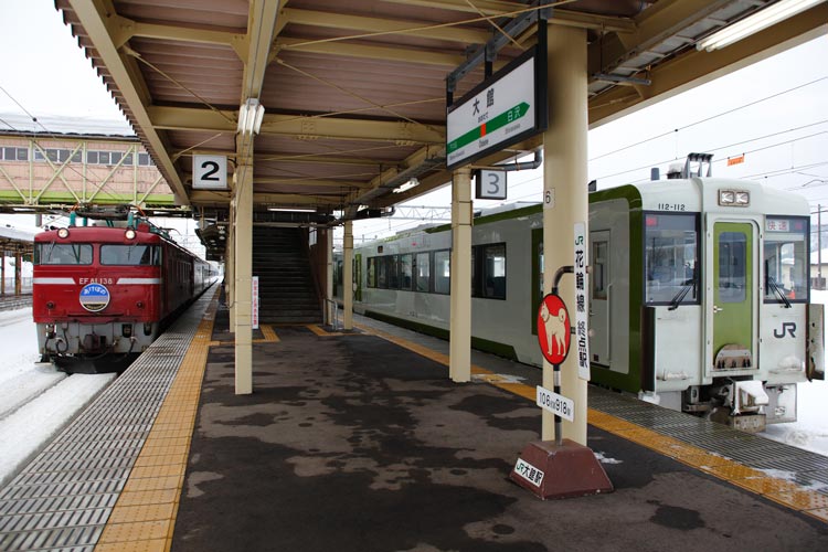 写真は、大館名物「鶏めし弁当」を手に「あけぼの」到着を待つ尾根遺産。