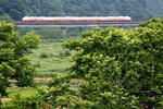 緑一色に染まった沿線には、赤いラインが映えます。