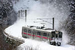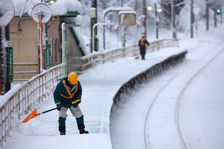 陣場の雪は半端なく、陣場駅構内では保線の方々が手作業で雪かき。
