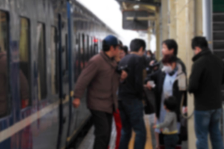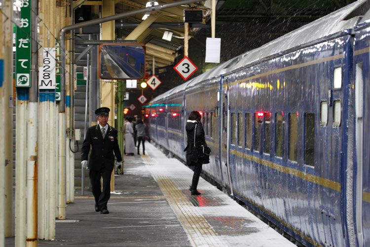 写真は、大館名物「鶏めし弁当」を手に「あけぼの」到着を待つ尾根遺産。