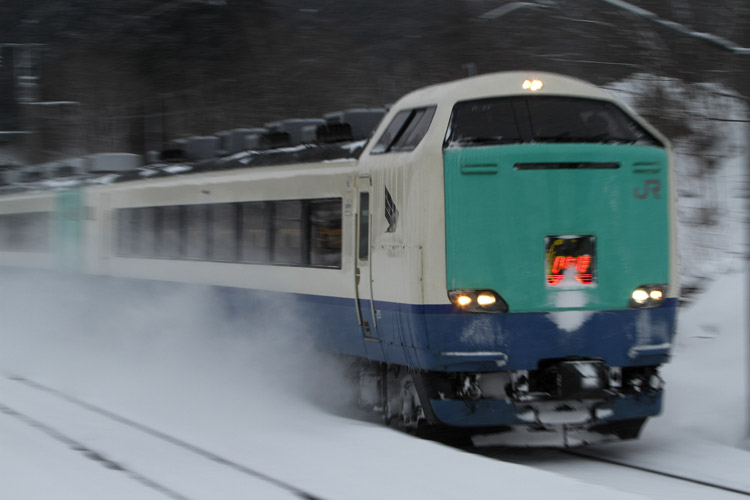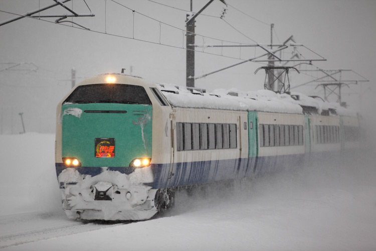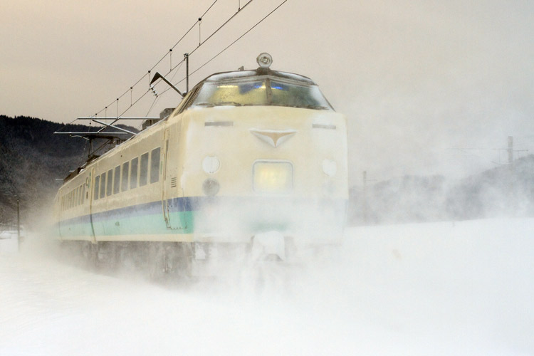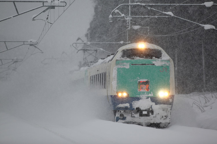 バックの山並みは完全にホワイトアウトで、車両中心の撮影。