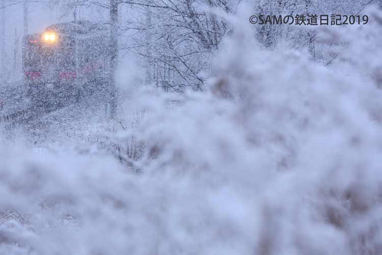 自宅前の空き地から、吹雪を縫って走る普電を捉えることが出来ました。